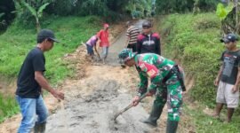 Berita Wujudkan Akses Layak, Babinsa Koramil 411-14/PR Kawal Pengecoran Jalan Swadaya di Kampung Payung Dadi