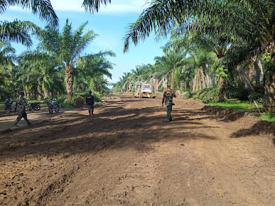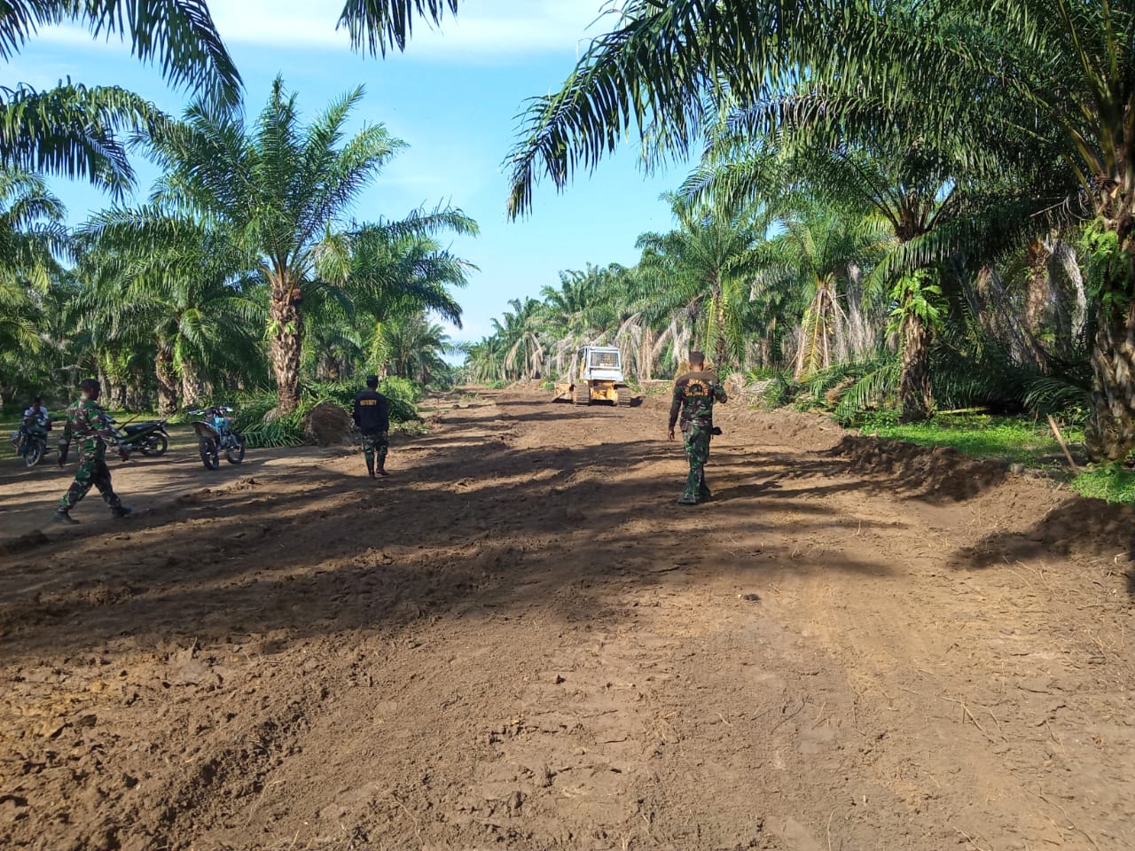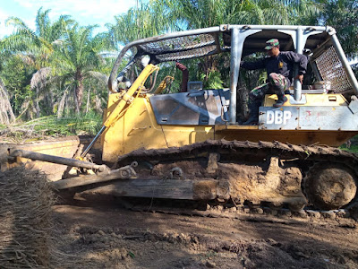 Kegiatan tersebut dilaksanakan dengan menggunakan Traktor dengan target awal merobohan pohon sawit sekaligus mendorong pohon dan rumput serta semak di sisi kiri/kanan badan jalan yang sedang dibuat.Â
