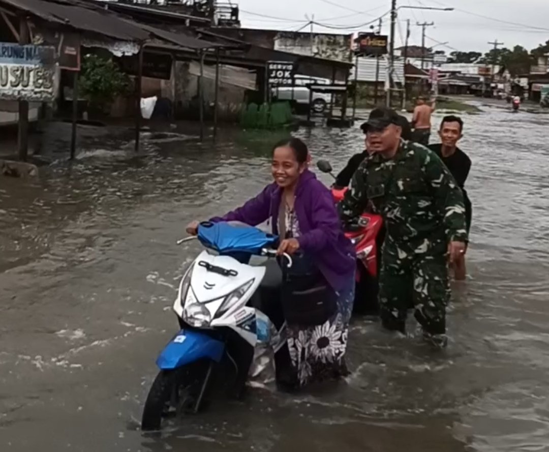 “Selain memantau kondisi debit air, Serda Ahmad Zen fokus membantu mengatur arus lalu lintas guna mencegah kemacetan panjang serta memandu pengendara agar tidak terjebak di titik air yang dalam yang dapat menyebabkan kendaraan mogok,” ucap Danramil.