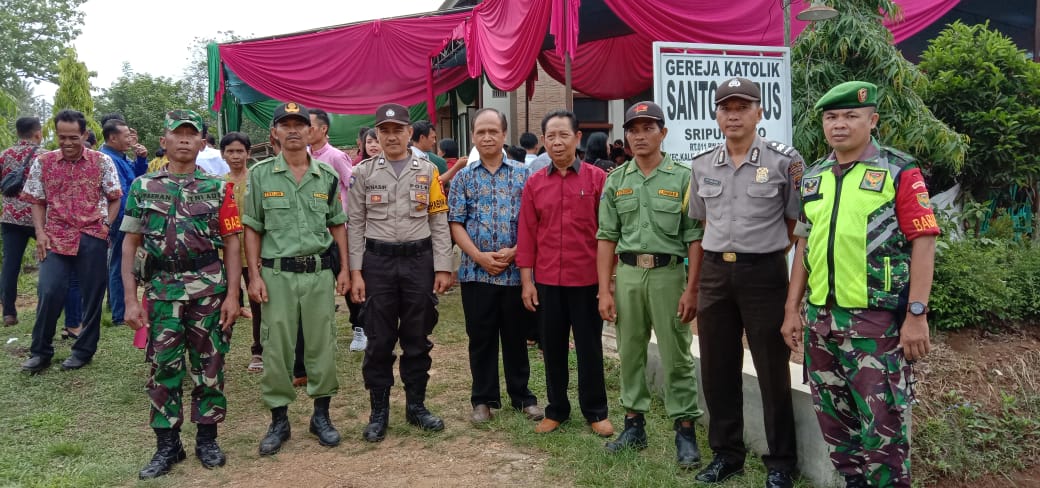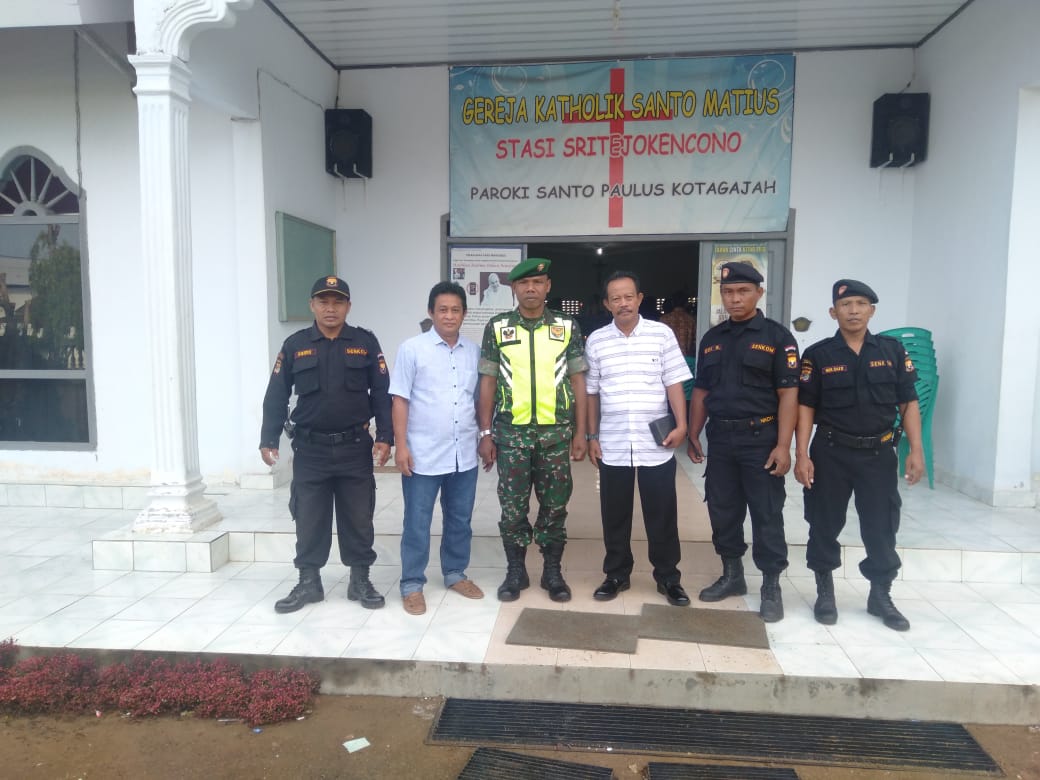 Serda Priyo Handoko Babinsa 411-07/ Punggur dan Anggota Polsek serta Organisasi Masyarakat Senkom  Pengamanan dan monitoring Kegiatan Ibadah Kebaktian (Misa) Natal 2019 di Gereja Santo Paulus Dusun V Kampung Sritejo Kencono Kecamatan Kota Gajah Kabupaten Lampung Tengah dipimpin FDR Fritz DSA.