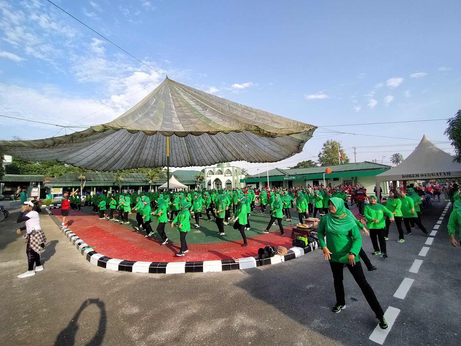 Dandim 0411/LT Letkol Czi Burhannudin,S.E.M.Si didampingi Ketua Persit KCK Cabang XXXI Dim 0411/LT Ny. Eka Pratiwi Burhannudin memimpin langsung kegiatan senam bersama dengan istruktur senam dari Bandar Lampung.