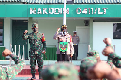 Kodim 0411/LT dan Polres Metro menggelar Apel Gabungan yang dipimpin langsung oleh Komandan Kodim 0411/LT Letkol Czi Burhannudin,S.E.,M.Si dan Kapolres Metro AKBP. Retno Prihawati,S.Sos.,S.IK.,M.H. di lapangan apel Makodim 0411/LT Jalan Veteran 22 Hadimulyo Metro Pusat Kota Metro. Senin pagi (20/07/2020)