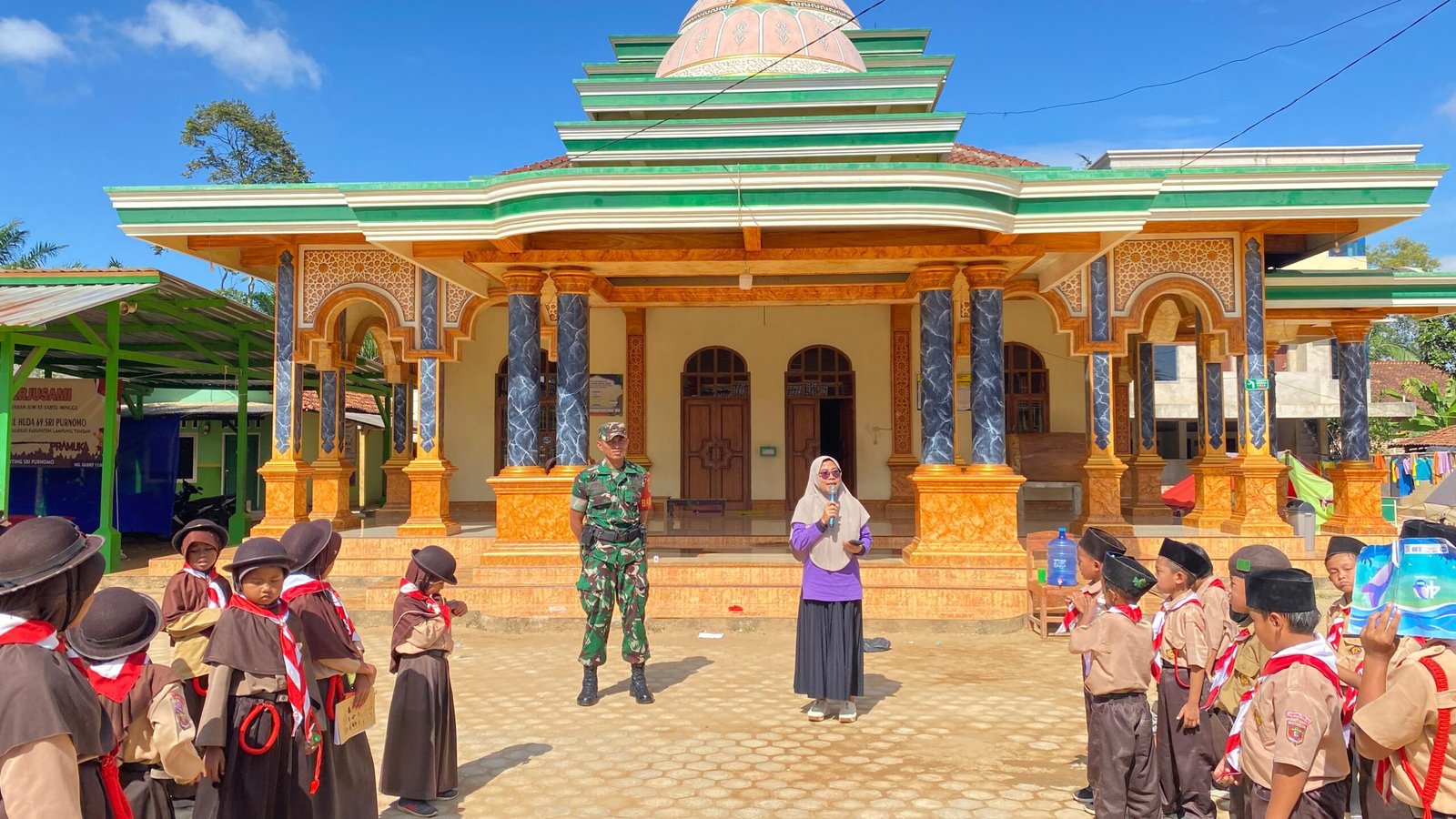 Serda Triyadi, Anggota Babinsa Koramil 411‑15/Kalirejo Kodim 0411/KM, memberikan materi kepemimpinan pada kegiatan Perkemahan Jum’at‑Sabtu‑Minggu (Perjusami) MI Nurul Huda Srimulyo, Kecamatan Kalirejo, Kabupaten Lampung Tengah. Sabtu (20/12/2025)