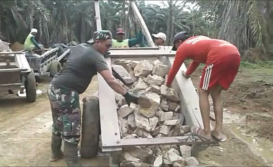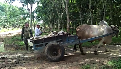 “Kurang 200 meter lagi, ini akan cepat selesai bila cuaca cerah, namun saat ini kondisinya hampir setiap malam turun hujan yang lebat dan lama, sehingga material yang dikirimkan oleh mobil dum truck tidak bisa sampai kepada titik sasaran, untuk itu kita memanfaatkan transportasi tradisional yang masih banyak dipergunakan oleh masyarakat di kampung ini, transportasi tersebut adalah pasukan gerobak dengan tenaga penggerak seokar sapi” ucap Kapten Inf Suprobo sambil tersenyum.