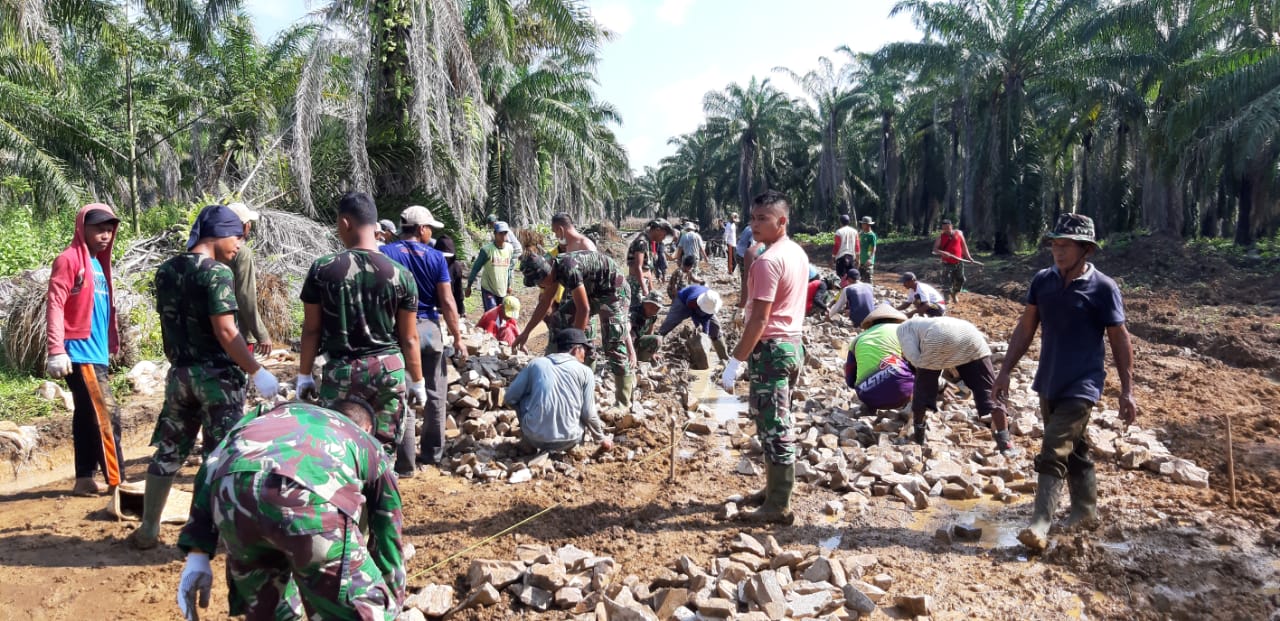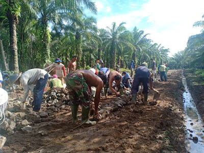 Demi mempercepat target penyelesaian jalan, 50 orang yang terdiri dari Satgas TMMD dan masyarakat bersatu padu dengan penuh semangat dan kekompakan memaksimalkan pengerjaannya. (DL)
