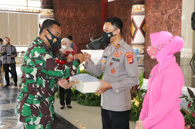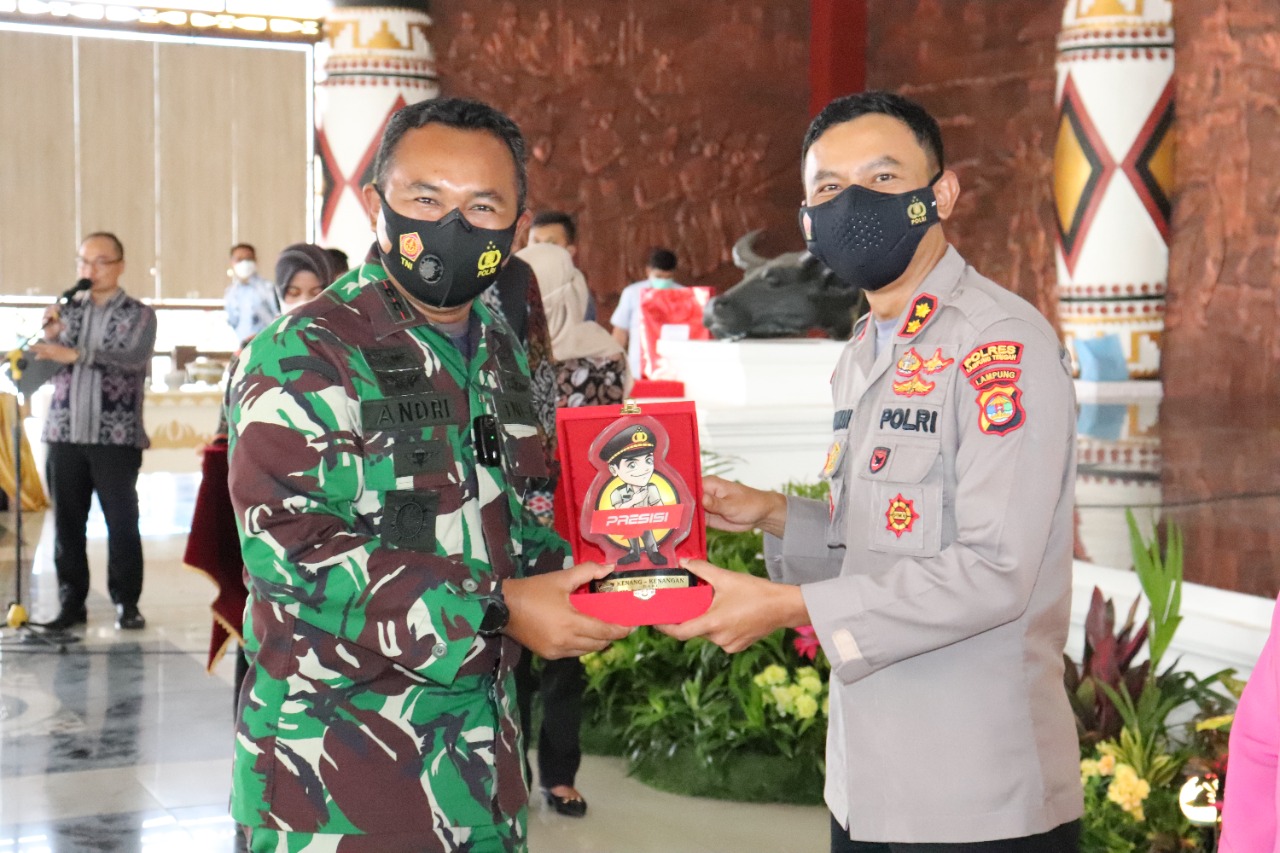 Dandim 0411/ LT Letkol Inf Andri Hadiyanto,M.Han. mendampingi Bupati Lampung Tengah Hi. Musa Ahmad,S.Sos hadir dalam acara pisah sambut Kapolres Lampung Tengah dari pejabat lama AKBP Wawan Setiawan,S.IK kepada pejabat yang baru yaitu AKBP Oni Prasetya,S.IK bertempat di Nuwo Balak Lamteng. Sabtu (14/08/21)