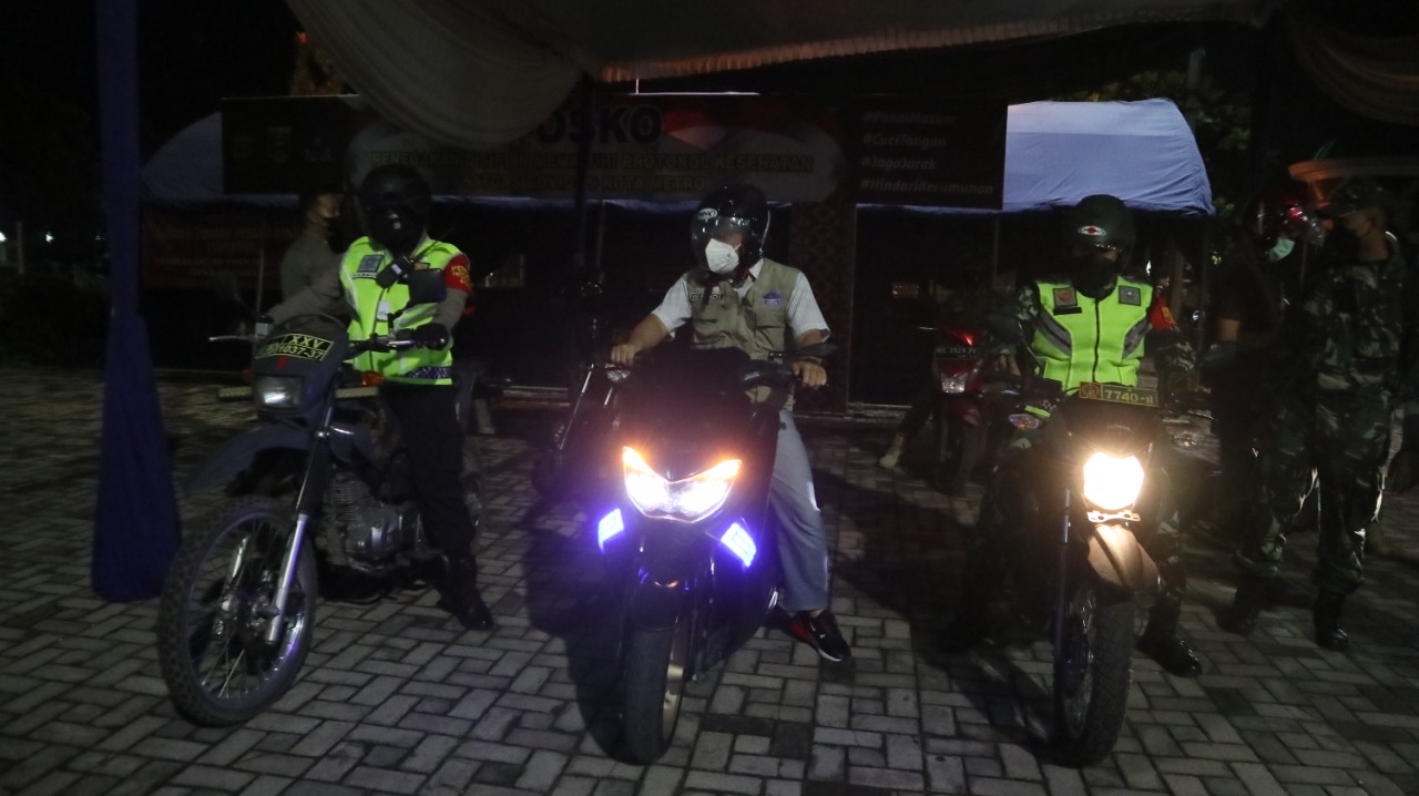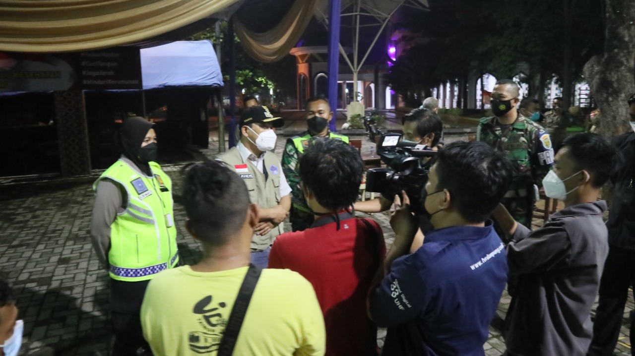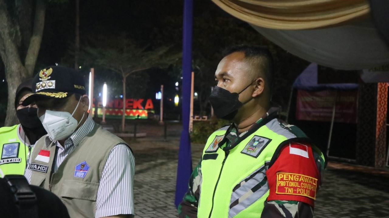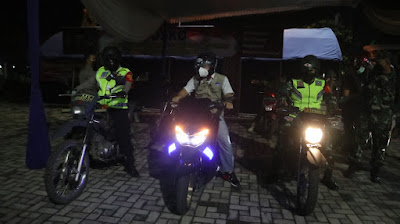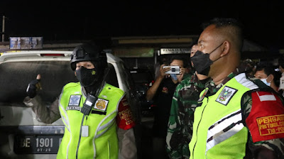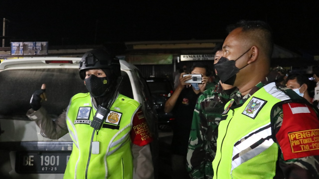 Dandim 0411/KM Letkol Inf Andri Hadiyanto, M.Han. bersama Kapolres Metro AKBP Retno Prihawati,S.Sos.,S.I.K., M.H. mendampingi Walikota Metro dr. H. Wahdi Siradjudin, SP.OG (K) bersinergi melaksanakan kegiatan operasi yustisi sekaligus melakukan pengecekan titik-titik penyekatan dan Pemberlakuan Pembatasan Kegiatan Masyarakat (PPKM) darurat Kota Metro, Rabu, malam (14/07/21).