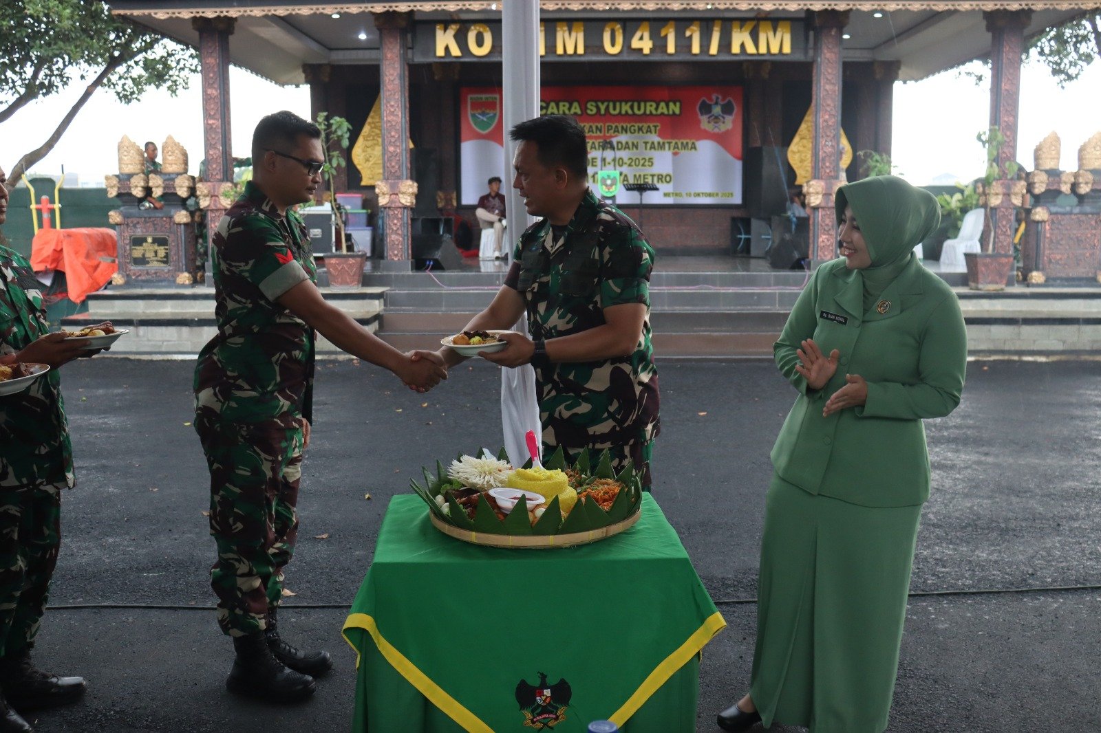 Kodim 0411/KM menggelar acara Syukuran Korps Raport Kenaikan Pangkat Perwira, Bintara dan Tamtama periode 1 Oktober 2025 bertempat di Lapangan Apel Makodim 0411/KM, Jalan Veteran No. 53 Bd. 22 Kel. Hadimulyo Barat Kec. Metro Pusat, Kota Metro. Jum’at sore (10/10/2025)