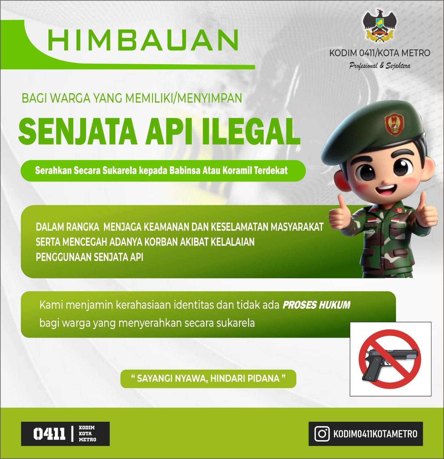 Komandan Kodim 0411/KM, Letkol Inf Noval Darmawan, S.H., M.I.P., mengambil langkah tegas guna memastikan keamanan dan ketertiban masyarakat (Kamtibmas) di wilayah Lampung Tengah dan Kota Metro tetap terjaga. Dandim secara resmi menginstruksikan seluruh Danramil jajaran dan Babinsa untuk aktif turun ke tengah masyarakat memberikan imbauan terkait kepemilikan senjata api (senpi) ilegal atau rakitan. Selasa (24/02/2026)