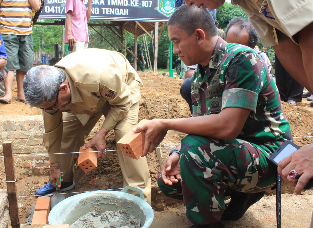 Pemasangann Batu pertama di pondasi rumah Haidori merupakan kegiatan selanjutnya setelah peletakkan batu pertama di Musholla Nurul Huda. (Tim MC Kodim 0411/LT)