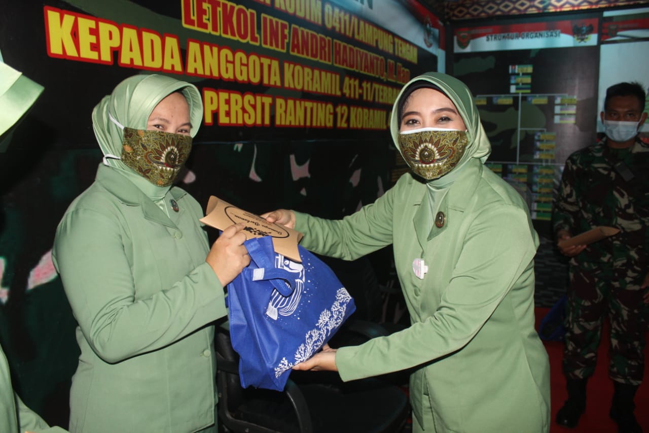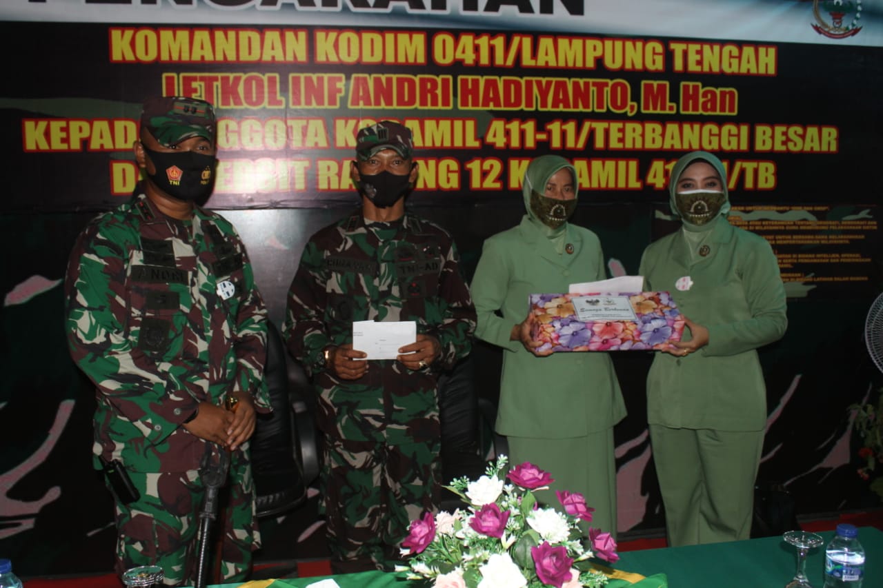 Pada kesempatan tersebut Dandim dan Ketua Persit memberikan bantuan uang pembinaan untuk kas koramil dan persit serta beberapa anggota yang mengikuti pengarahan, selanjutnya Dandim dan Ketua Persit memberikan bingkisan kepada piket Koramil.