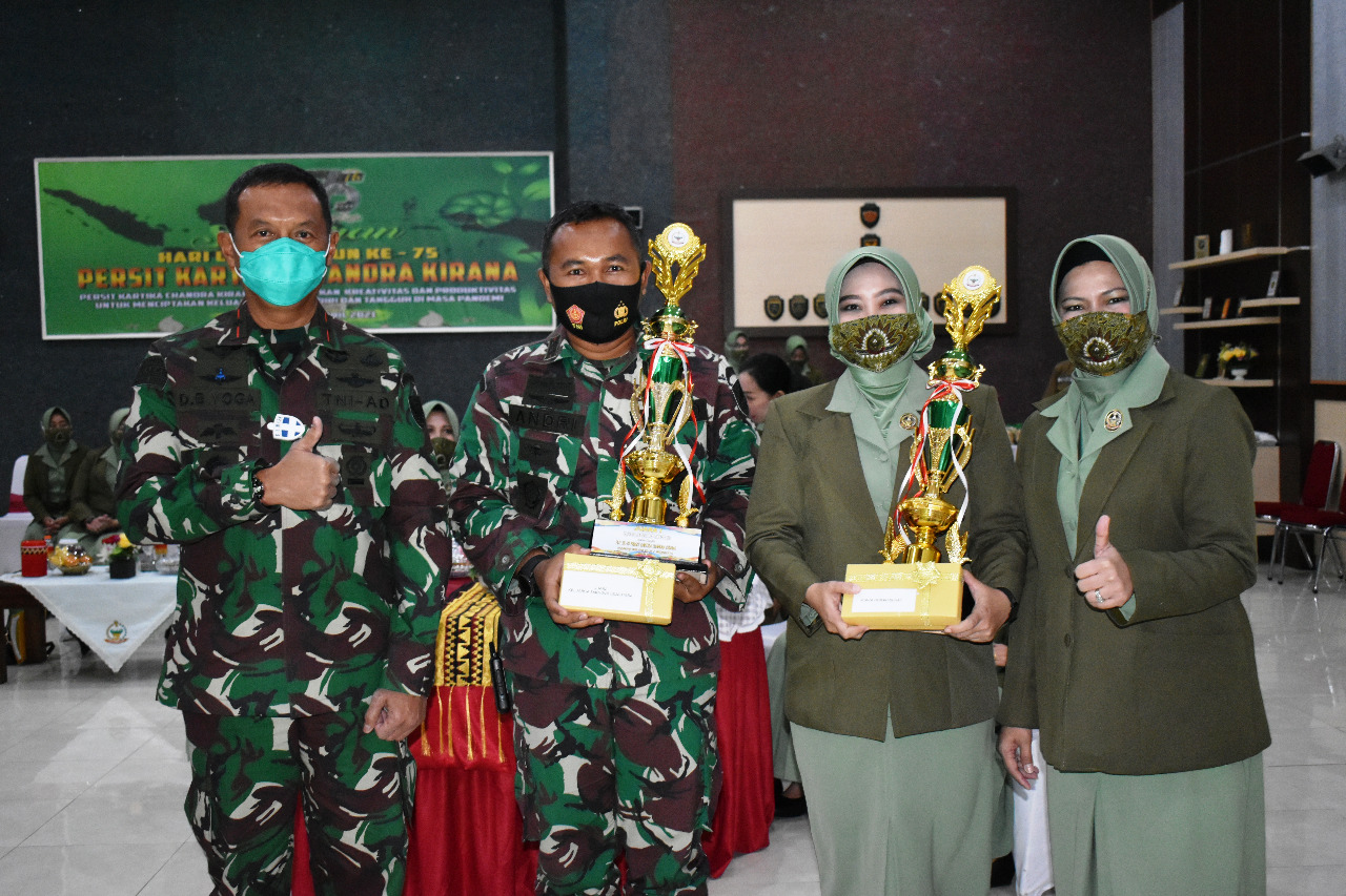 Pemberian Piala diberikan langsung oleh Komandan Korem 043/Garuda Hitam Brigjen TNI Drajad Brima Yoga, S.I.P., M.H., dan Ketua Persit KCK Koorcab Rem 043 PD II/Swj Ibu Epie Yoga.