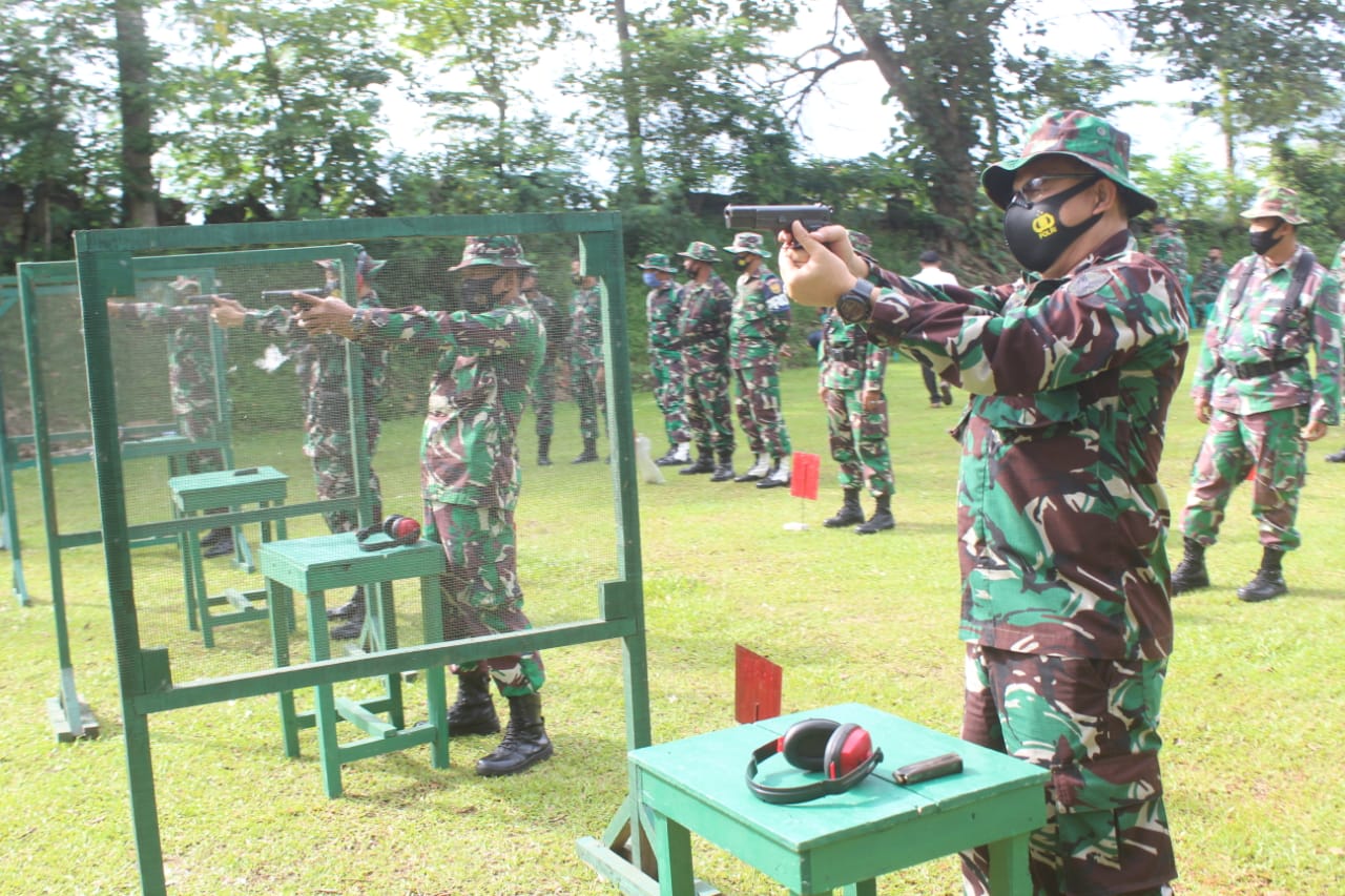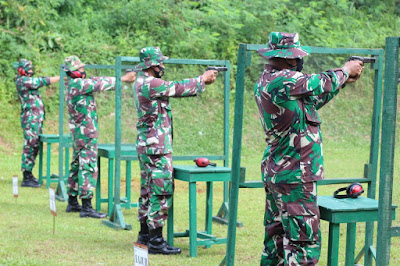 Ikut serta dalam latihan menembak pistol, Kasdim 0411/LT Mayor Inf Bagus Setiawan S.Sos., Pabung Lamteng Mayor Inf Asrin, perwira staf berserta Danramil jajaran Kodim 0411/LT.