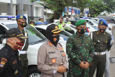 Dandim 0411/LT Letkol Inf Andri Hadiyanto,M,Han. dan Walikota Metro Hi. A Pairin,S.Sos. mendampingi Kapolres Metro AKBP Retno Prihawati,S.Sos.,S,IK.MH. memimpin Apel Gelar Operasi Lilin Krakatau 2020 dalam rangka pemeliharaan keamanan dan ketertiban masyarakat (Kamtibmas) menjelang Hari Raya Natal Tahun 2020 dan Tahun Baru Tahun 2021 Kota Metro di Halaman Apel Mapolres Metro Jl. Diponegoro No.06 Kota Metro. Senin (21/12/2020)