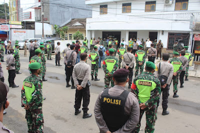 Tim Satgas Covid – 19 yang terdiri dari gabungan Kodim 0411/LT, Polres Metro, Pemkot Metro menggelar Apel Gabungan Bersekala Besar untuk melaksanakan penerapan physical distancing bagi pedagang dan pembeli di area pasar Cendrawasih, Mega Mall dan Pasar Kopindo Kota Metro pagi dan malam hari.
