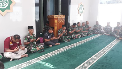 Pelda Subadri selaku imam sholat menyempatkan untuk memanjatkan doa untuk keluarga Dandim 0411/LT yang telah tiada dengan di-Aamiin-i oleh jama’ah.
