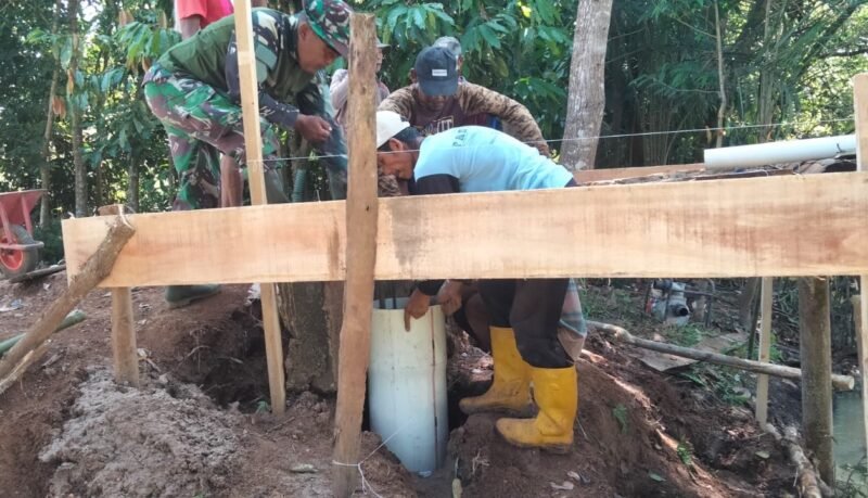 “Kami bersama warga telah menyelesaikan pembongkaran jembatan lama dan pembentukan jalan akses. Saat ini personel TNI, dibantu tukang dan 25 orang masyarakat setempat, sedang fokus pada perakitan besi, pemasangan paralon cor paku bumi, hingga tahap pengecoran paku bumi,” lapor Serka Fauzan. Dukungan material seperti 50 sak semen dan puluhan batang besi ulir 16″ telah terdistribusi maksimal untuk menjamin kekokohan bangunan.