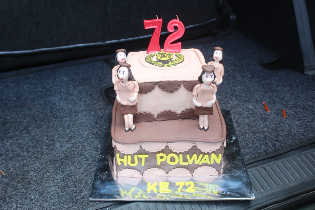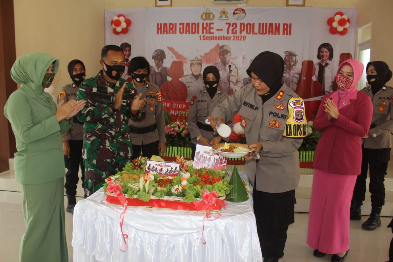 Ketua Persit Kartika Candra Kirana (KCK) Cabang XXXI Dim 0411 Koorcab Rem 043 Ny. Novi Andri Hadiyanto didampingi Dandim 0411/LT Letkol Inf Andri Hadiyanto,M.Han., Kasdim Mayor Inf Bagus Setiawan,S.Sos, para Perwira Kodim 0411/LT dan Pengurus Persit KCK Cabang XXXI beri surprise Kue Selamat Ulang Tahun kepada para Polwan di Polres Metro di Hari Jadi ke-72 Polwan RI. Selasa (01/09/2020)