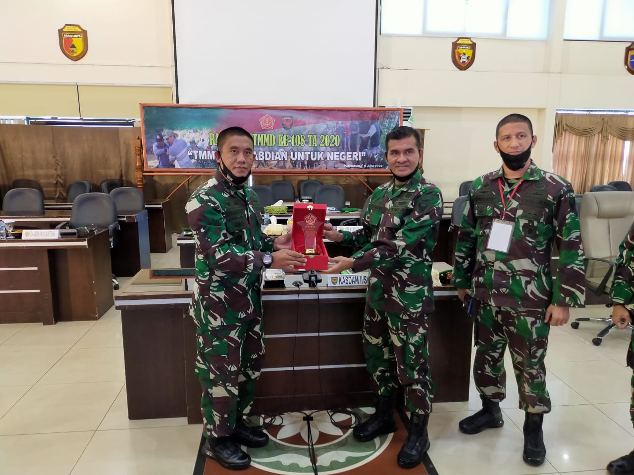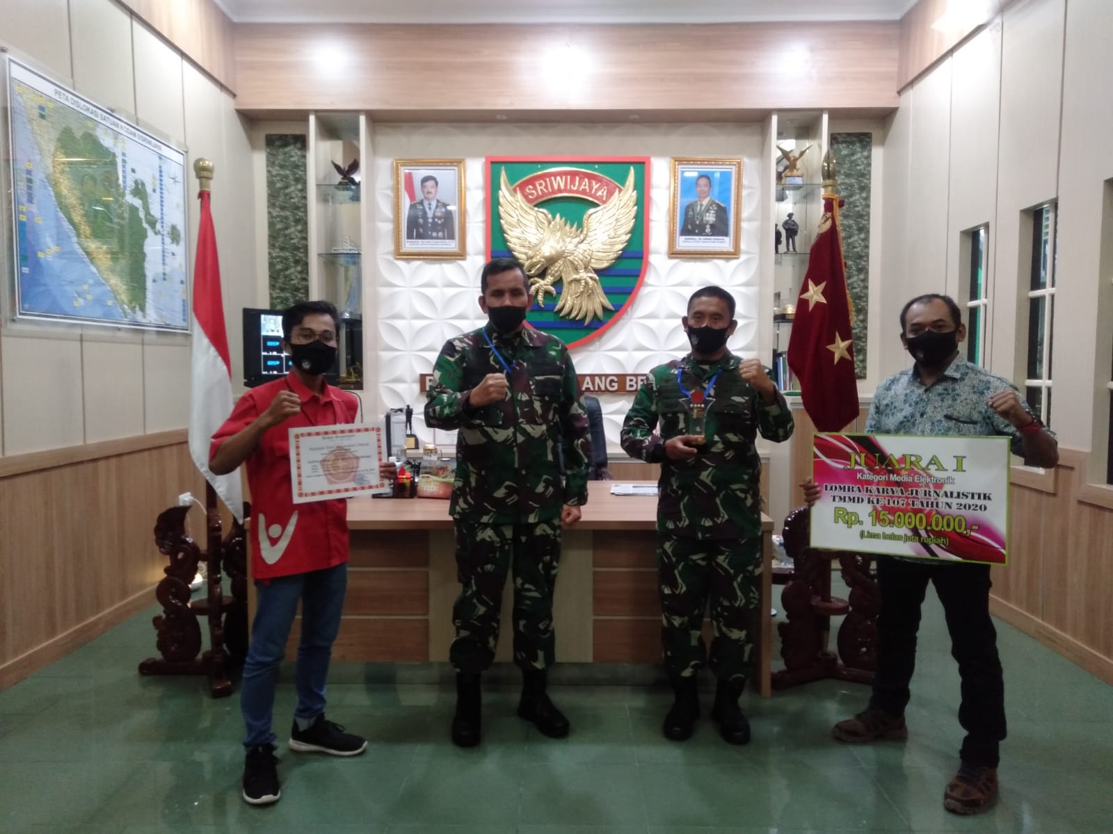 Dandim 0411/LT Letkol Czi Burhannudin,S.E,.M.Si selaku Dansatgas TMMD ke 107 Tahun 2020 bersama Edi Supriyanto mewakili Kodim 0411/LT menerima Piala, Piagam dan Hadiah sebagai Pemenang Juara 1 Lomba Karya Jurnalistik TMMD Reguler Ke-107 Tahun 2020 tingkat nasional kategori Media Elektronik di Markas Komando Daerah Militer II/Sriwijaya. Selasa (09/06/2020)