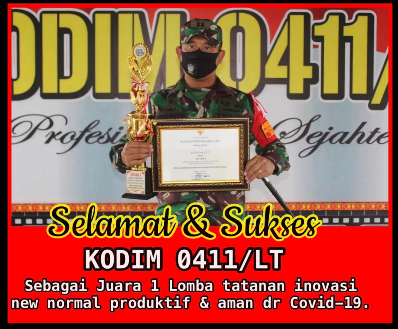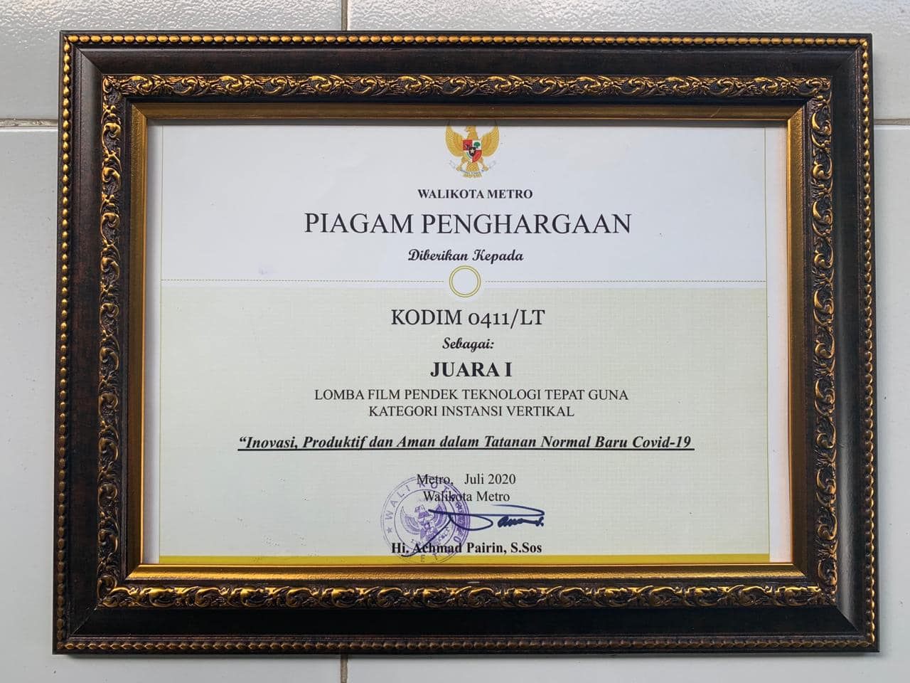 Video inovasi tatanan normal baru produktif dan aman covid-19 karya Kodim 0411/LT terpilih menjadi pemenang Juara I dari beberapa peserta Organisasi Perangkat Daerah (OPD) dan Instansi Vertikal yang diselenggarakan oleh Pemerintah Kota (Pemkot) Metro. Rabu (22/07/2020)