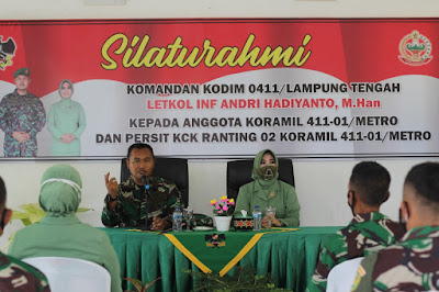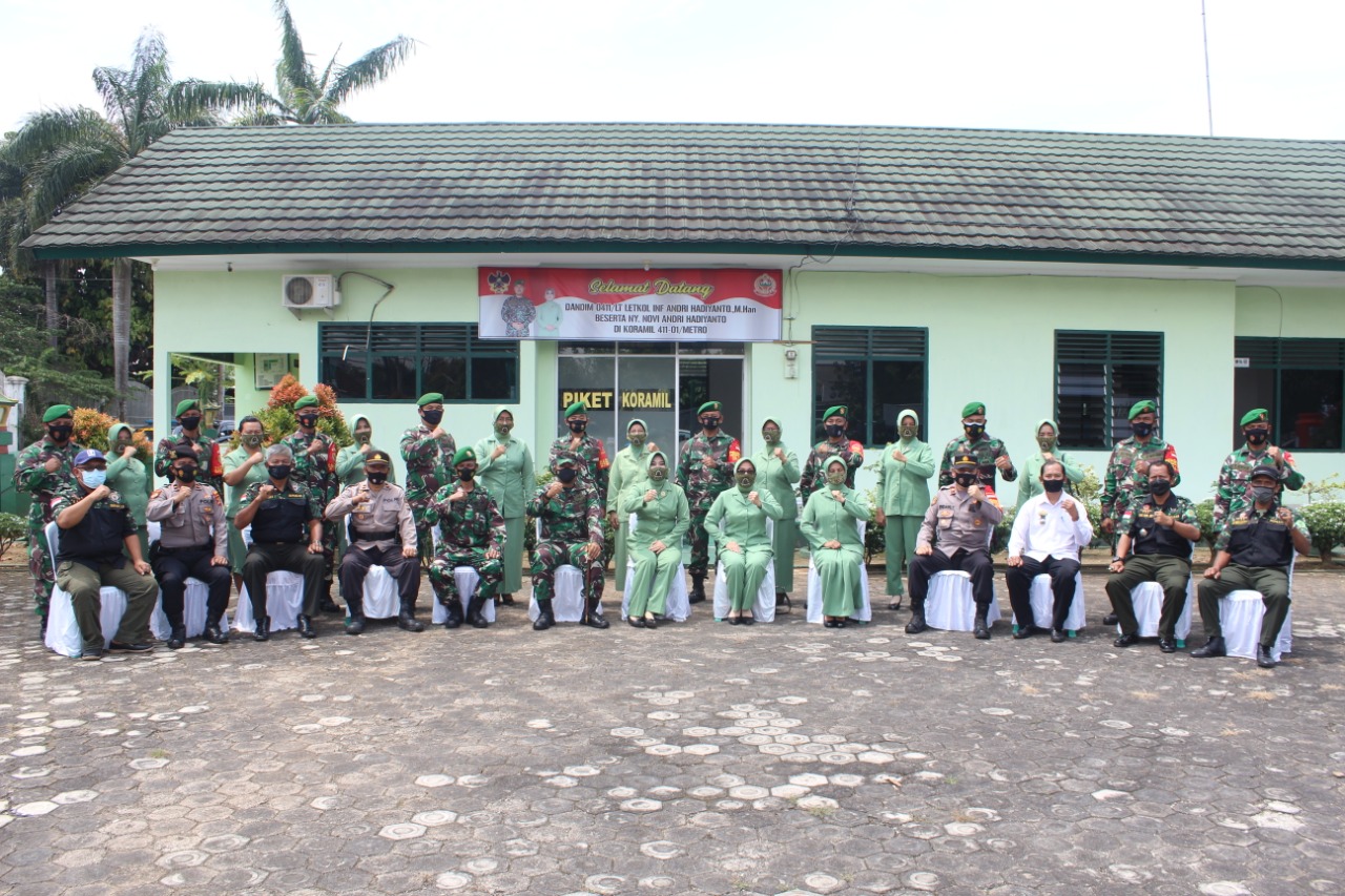 Komandan Kodim 0411/LT Letkol Inf Andri Hadiyanto,M.Han didampingi Ketua Persit Kartika Chandra Kirana Cabang XXXI Ny. Novi Andri Hadiyanto dan Pasi Ops Kapten Chb Santoso serta Plh. Pasi Pers Kapten Inf Sapji, melakukan Kunjungan Kerja (Kunker) ke Koramil 411-01/Metro Jalan Jendral Achmad Yani Kota Metro, Rabu (03/03/2021).