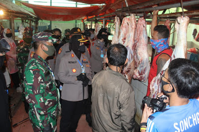 Tidak luput dari kedua orang no satu ini, lapak dagangan daging sapi pun menjadi salah satu sasaran yang harus diperhatikan, keduanya tidak henti-nya menghimbau kepada pedagang dan pembeli di pasar tersebut agar terus menjaga dan menerapkan Physical Distancing yang sudah dilaksanakan oleh masyarakat sampai pandemi Covid 19 berakhir. (DL)
