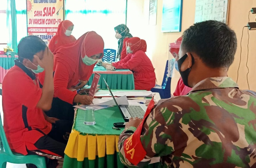 Babinsa Koramil Jajaran Kodim 0411/LT melaksanakan pendampingan Vaksinasi Sinovac terhadap tenaga kesehatan di wilayah binaan setelah pencanangan Vaksinasi Covid 19 tingkat Kabupaten Lampung Tengah dan Kota Metro diawali oleh Forkopimda. Sabtu (30/01/2021)