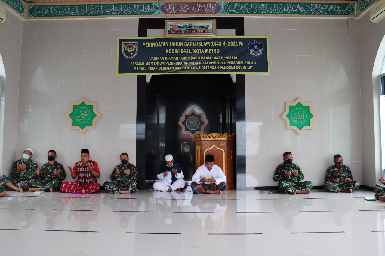 Komandan Komando Distrik Militer (Kodim) 0411/KM Letkol Inf Andri Hadiyanto,M.Han. bersama prajurit Makodim 0411/KM menggelar doa bersama dengan cara membaca Surat Yasin berjamaah diimami oleh Serda Suwandi dan doa oleh Peltu Subadri, dalam rangka memperingati 1 Muharram 1443 H, mengusung tema JADIKANLAH TAHUN BARU ISLAM 1443 H/2021 M SEBAGAI MOMENTUM PENINGKATAN NILAI-NILA SPRITUAL PERSONEL TNI-AD MENUJU INSAN BERIMAN DAN BERTAQWA DI TENGAH PANDEMI COVID-19 di Masjid Al It-Tihad Jalan Veteran Bedeng 22 Hadimulyo Barat Kota Metro, Jumat (13/08/2021).