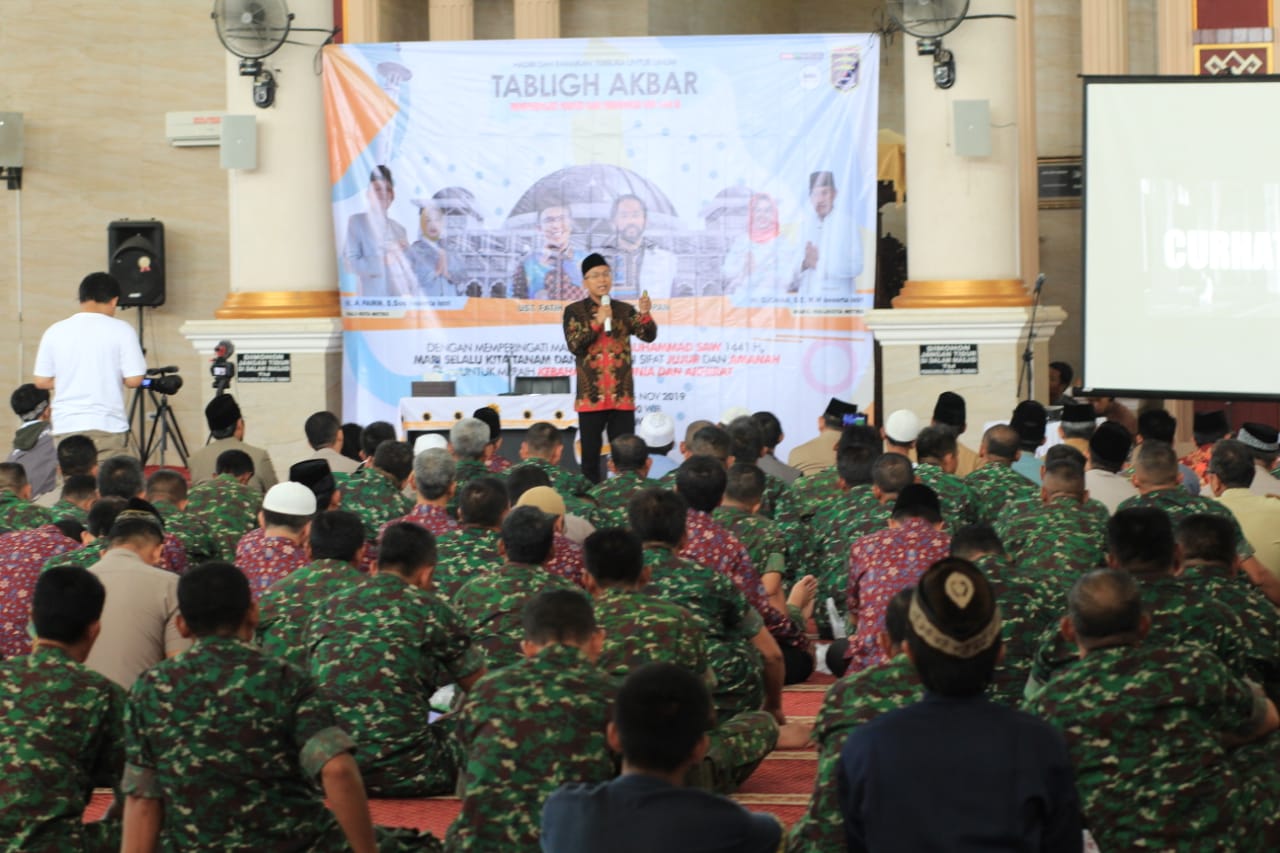 Personel Kodim 0411/LT dengan tertua Plh Kasdim 0411/LT Mayor Inf Baguss S. menghadiri Tablik Akbar sekaligus memperingati Maulid Nabi Muhammad SAW 1441 H/2019 bertema ‘Dengan Peringatan Maulid Nabi mari kita tanam dan amalkan sifat jujur dan amanah untuk meraih kebahagiaan dunia dan ahirat’ bertempat di Masjid A Taqwa Kecamatan Metro Pusat dengan Narasumber/Penceramah Ustad Fatih Karim dan Cuping Topan dari Jakarta. Senin (25/11)