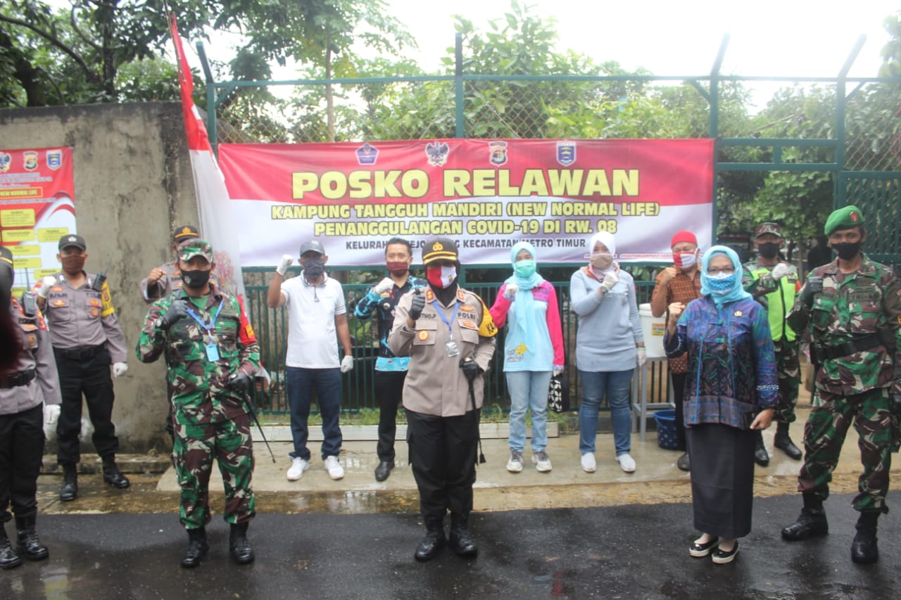 Rombongan yang terdiri dari Walikota Metro Hi. Acham d Pairin,S.Sos, Dandim 0411/LT Letkol Czi Burhannudin,S.E.,M.Si, Kapolres Metro AKBP Retno Prihawati, S.Sos.,S.IK.,M.H, Kasdim 0411/LT Mayor Inf Ucok Namara, Kasat Intel Polres Metro AKP Edi Kurniawan, Kasat Binmas Polres Metro AKP Suardo, Pasi Ops Kodim 0411/LT Kapten Inf Sunardi, Danramil 411-01/Metro, Kapolsek Metro, Sekcam Metro, Lurah Metro, Babinsa dan Bhabinkamtibmas Metro serta Tomas dan Toga menyaksikan secara langsung Posko Kampung Tangguh Mandiri yang dibentuk oleh Swadaya masyarakat yang tergabung dalam “Relawan Penegak Disiplin Protokol Kesehatan kelurahan Metro”.