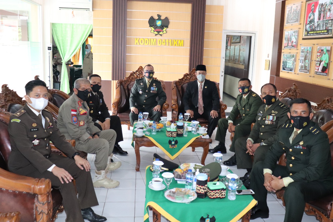 Telihat Hadir di Makodim 0411/KM, Kasdim Mayor Inf Bagus Setiawan,S.Sos., (mewakili Dandim 0411/KM Letkol Inf Andri Hadiyanto,M.Han.) Perwakilan Polres Metro Kompol Zulkifli, Wakil Ketua 1 DPRD Kota Metro.Basuki S.Pd., Kasatpol PP Kota Metro. Imron,SP.Msi., Kasi Intel Kajari Kota Metro Rio Irawan P Halim,SH.,MH., Pasi Ops Kodim 0411/KM Kapten Inf Muslih, Dan Unit Intel Letda Arh Rahmat M., Pasandi dan perwakilan Anggota Kodim 0411/KM
