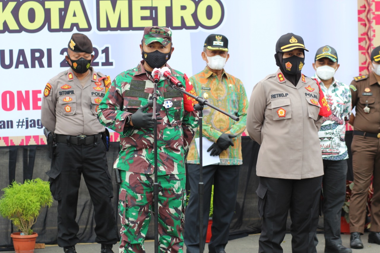 Komandan Komando Distrik Militer 0411/LT Letkol.Inf Andri Hadiyanto,M.Han. dan Kapolres Metro AKBP Retno Prihawati,S.Sos.,S.I.K.,M.H. mendampingi Walikota Metro Hi. Achmad Pairin,S.Sos. saat memimpin Apel Siaga Pencegahan Penanganan Covid-19, Kota Metro tahun 2021 dengan Komandan Apel Yose Sarminto SSTP, MH (Sekretaris Sat Pol PP) bertempat di sepanjang Jalan Jenderal Sudirman depan Taman Kota Metro. Kamis (14/01/21)